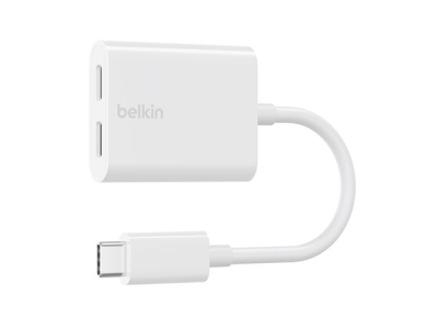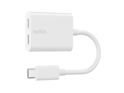 Belkin Connect Audio + Charge - USB-C till USB-C-hörlurar/laddningsadapter - USB-C hane till USB-C hona - 14 m - vit - USB Power Delivery (60W)