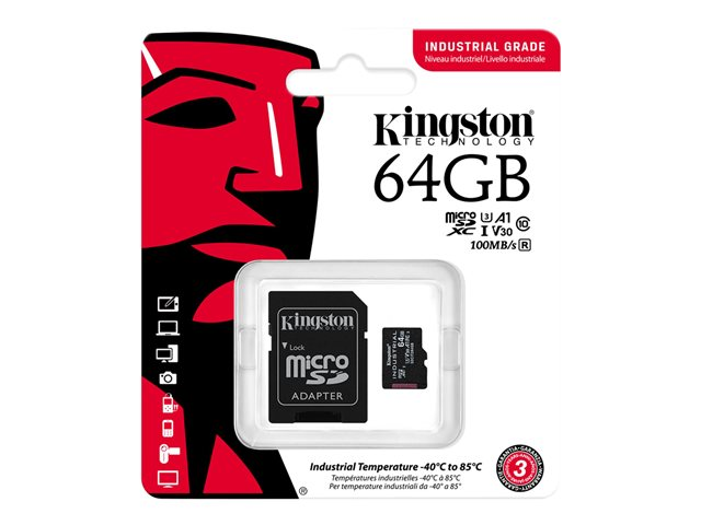 Kingston Industrial - Flash-minneskort (microSDXC till SD-adapter inkluderad) - 64 GB - A1 / Video Class V30 / UHS-I U3 / Class10 - mikroSDXC UHS-I SDCIT2/64GB