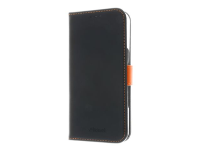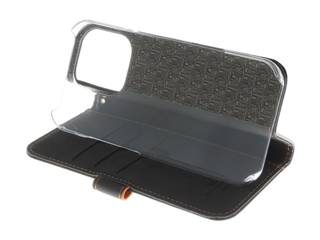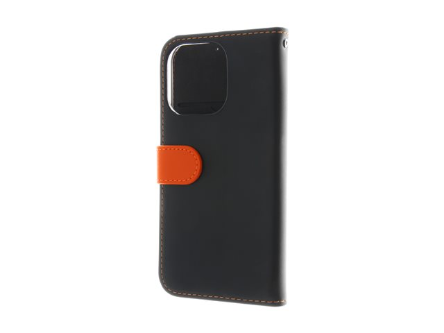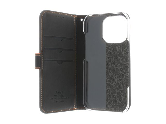 Insmat Exclusive - Vikbart fodral för mobiltelefon - genuint läder, kartong+papper+aluminiumfolie, polykarbonat (PC), bomullssömmar - svart/orange - för Apple iPhone 16 Pro