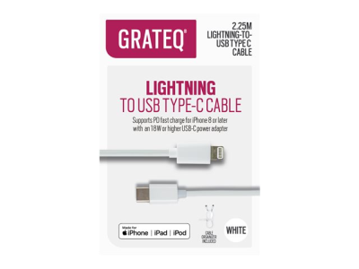 GRATEQ - Lightning-kabel - Lightning hane till 24 pin USB-C hane - 2.25 m - vit - USB-strömförsörjning (18W)