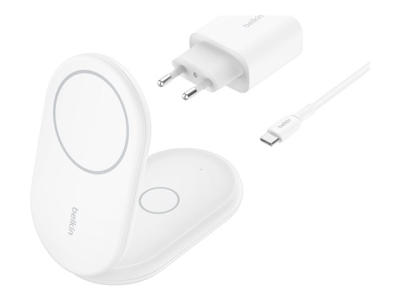 Belkin BoostCharge 2-in-1 - Trådlöst laddställ - magnetisk, hopfällbar, med Qi2 + växelströmsadapter - 15 Watt - Fast Charge - vit - för Apple iPhone 12, 13, 14, 15, 16