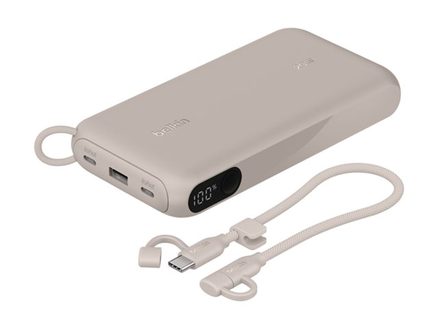 Belkin BoostCharge - Power bank - med display - 20000 mAh - 20 Watt - PD - 3 utdatakontakter (2 x USB-C, USB) - på kabel: USB-C - sand