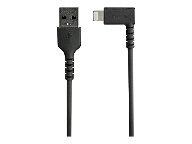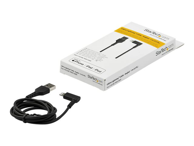 StarTech.com 1m tålig USB-A till Blixtkabel - svart 90° högervinkad, robust aramidfiber USB typ A till Blixtuppladdning/synkron sladd - Apple MFi-certifierad - iPhone - Lightning-kabel - Lightning hane vinklad till USB hane - 1 m - dubbelt skärmad - svart RUSBLTMM1MBR
